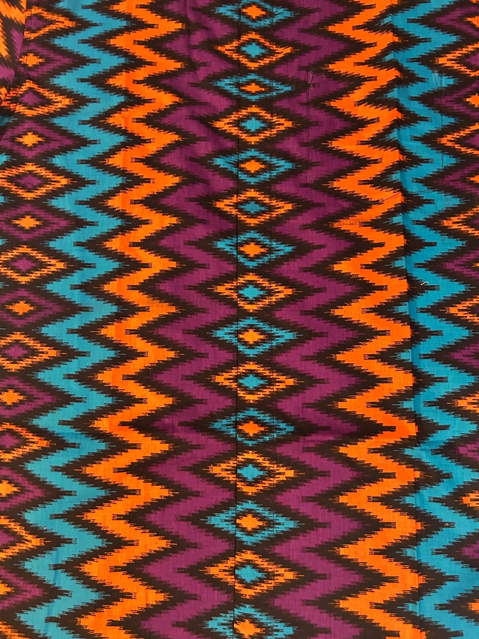 A bold short-sleeve shirt with a vibrant zigzag pattern in electric blue, fiery orange, and deep purple.