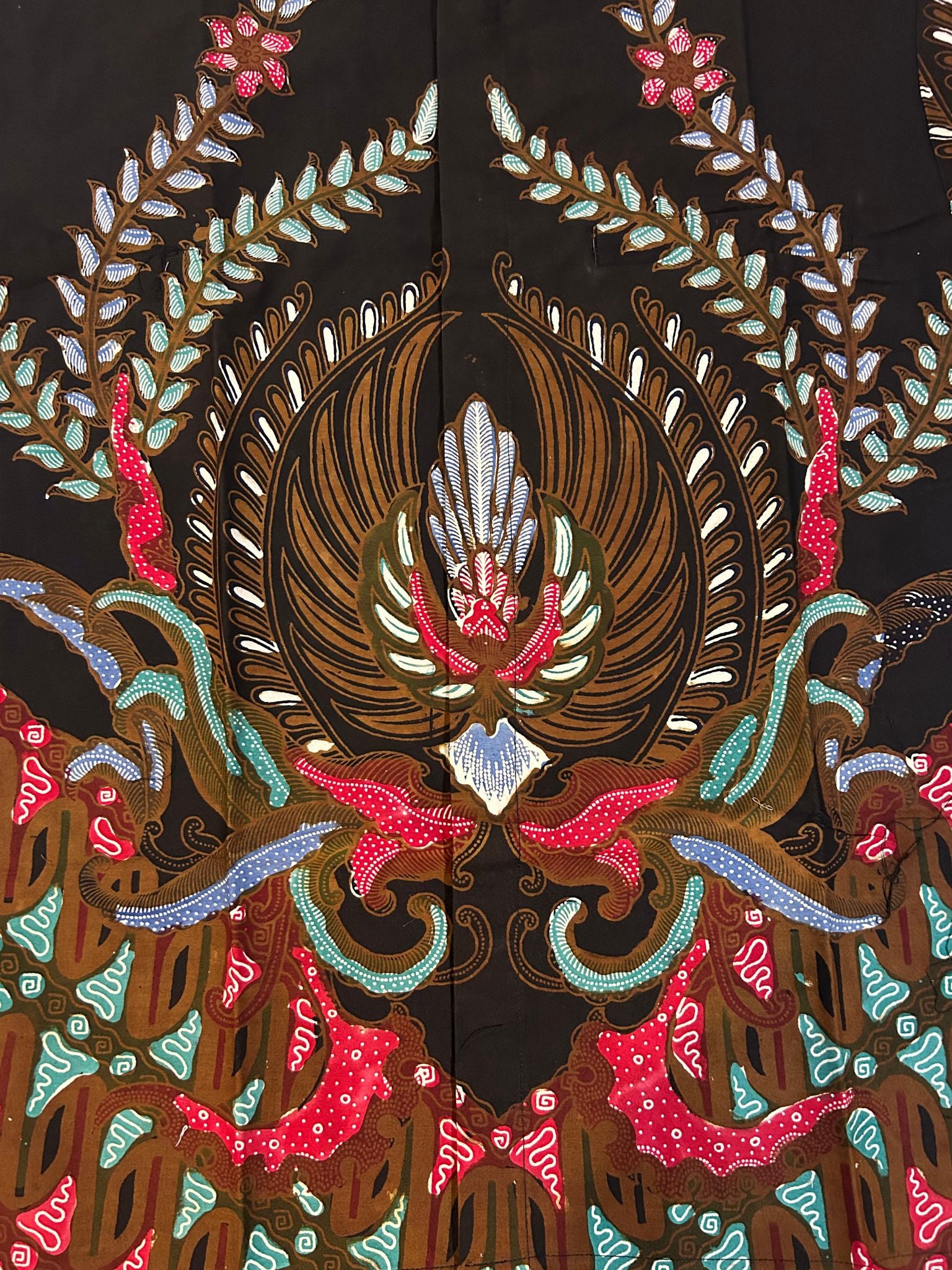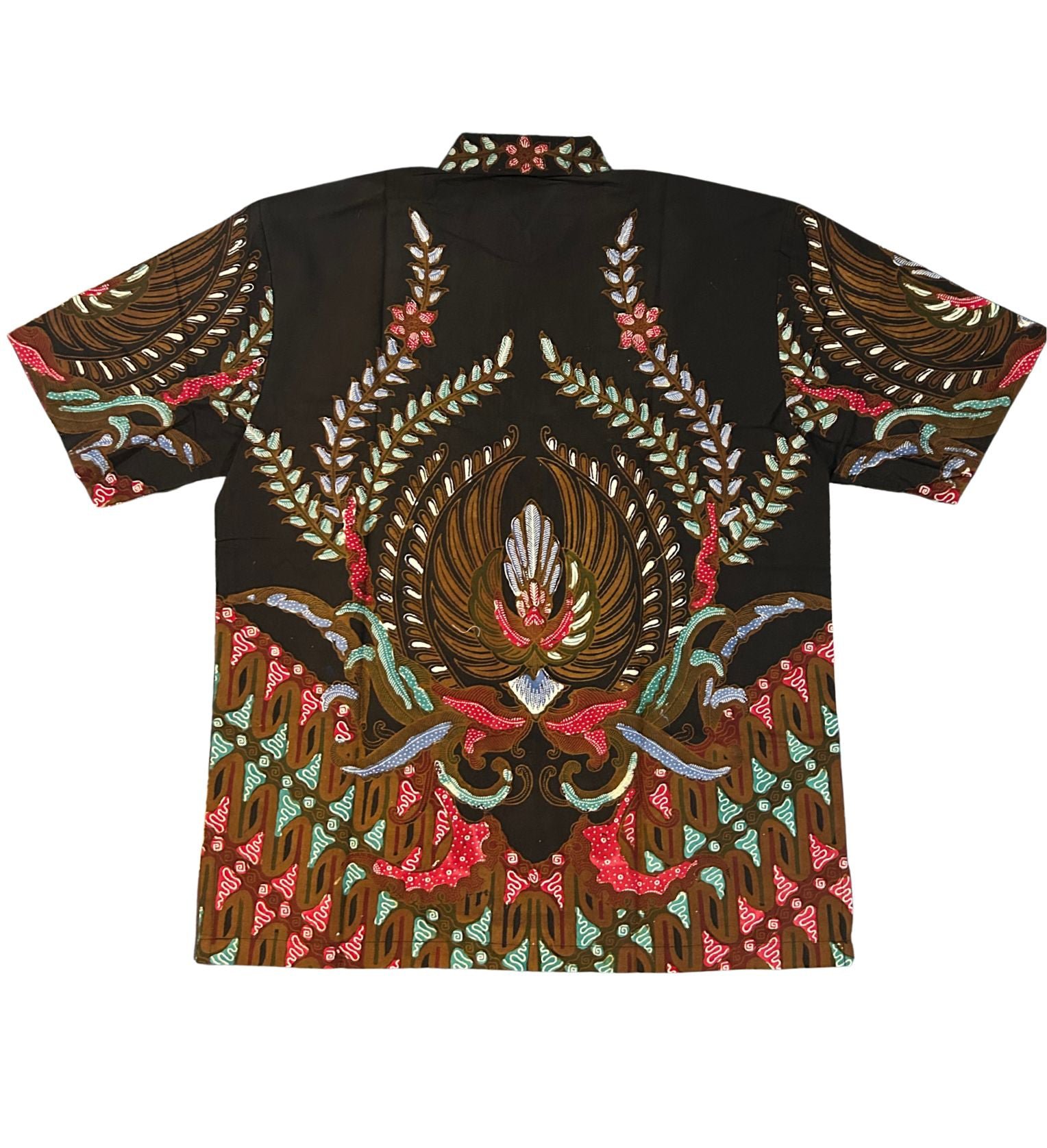 A bold batik shirt featuring fiery red and golden leaf motifs that radiate warmth and energy against a rich earthy backdrop.