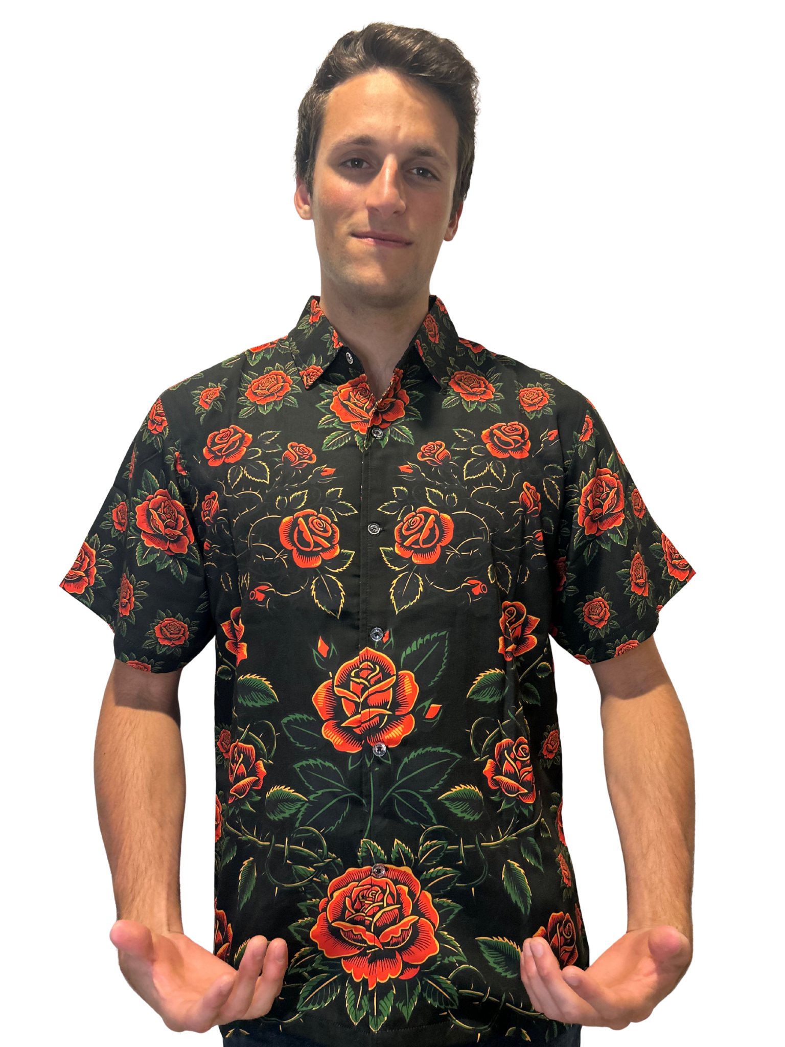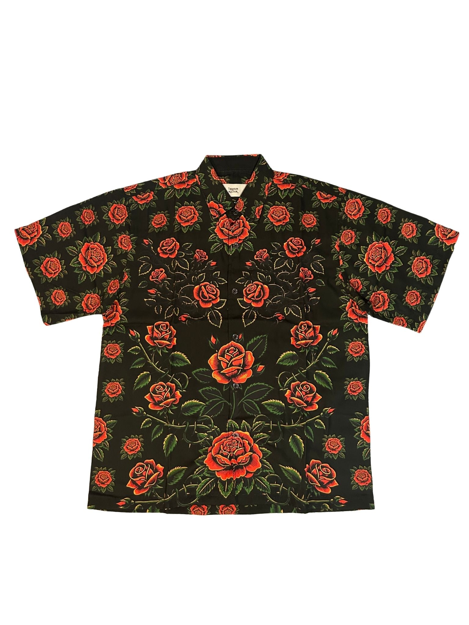 -A Beautiful batik shirt boldly adorned with lush crimson roses and winding green vines on an ivory base — a striking fusion of romantic floral.