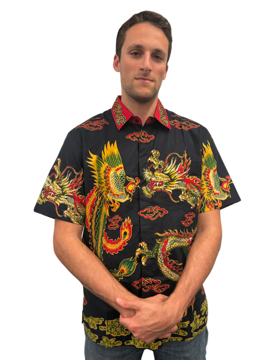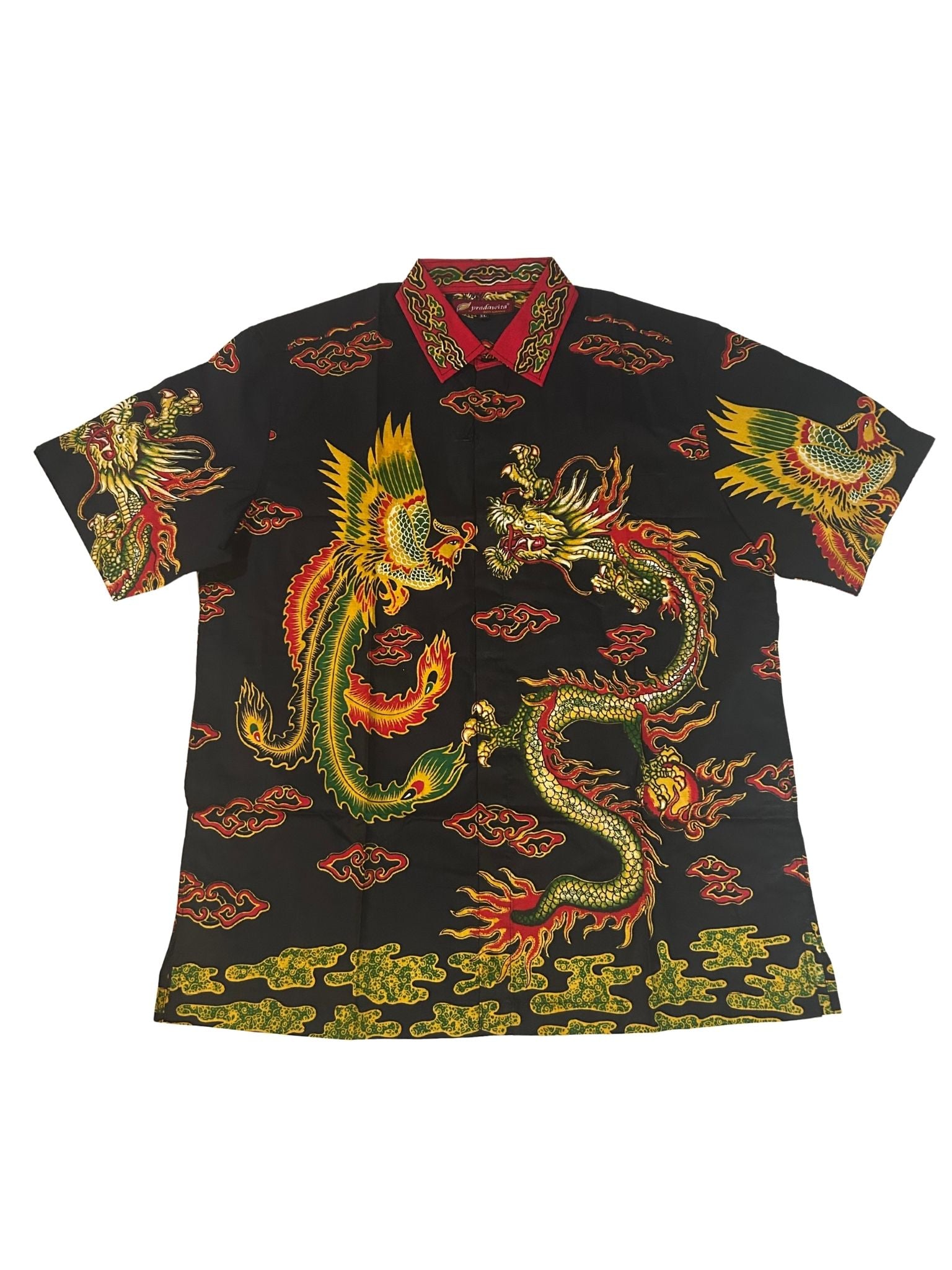 A Shirt With A Ton Of Flavor featuring an Exotic Flaming Dragon And Flaming Bird Staring At each other Surrounded by Red Clouds.